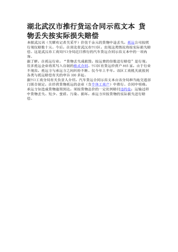 湖北武漢市推行貨運(yùn)合同示范文本 貨物丟失按實(shí)際損失賠償